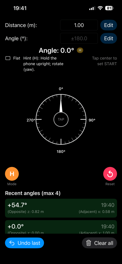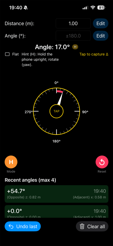Simply tap to set a start point, rotate your device, and capture the angle difference (Δ) in real time. The app instantly calculates adjacent and opposite triangle sides, so you can apply results directly in practical scenarios.